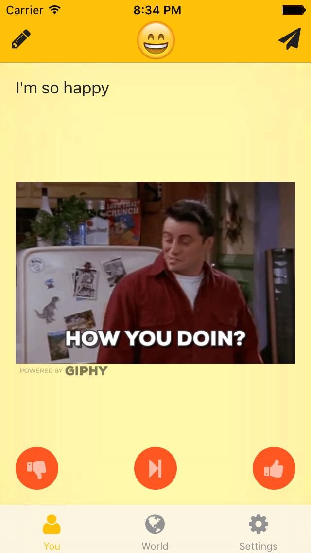 Find out how the world is feeling and take a look at what gifs they like, you will also do the same by selecting your mood and swiping right on the gifs that you like.